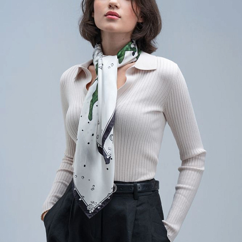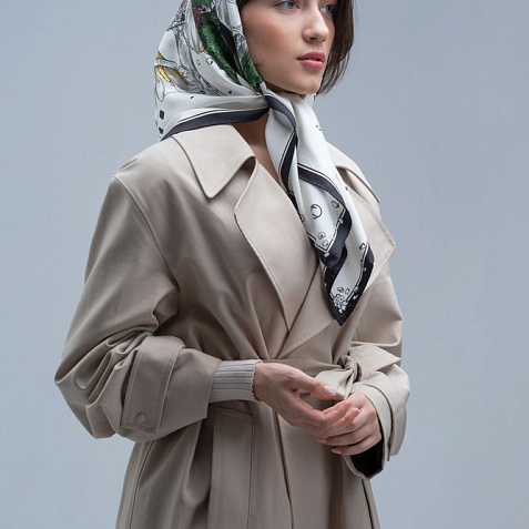 Шелковый платок с цветочным принтом открывает простор для фантазии — его можно использовать как шарф, головной убор или декоративный элемент для верхней одежды и аксессуаров.