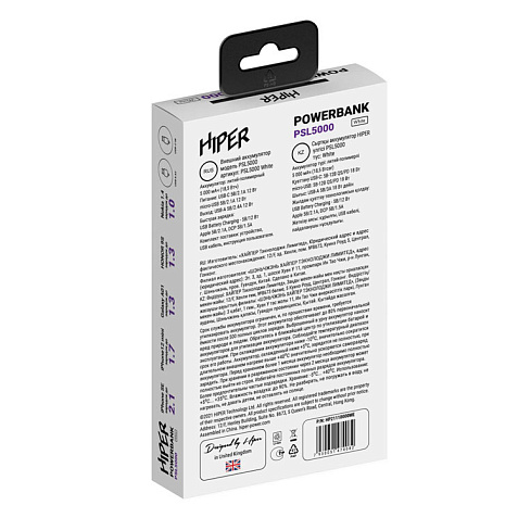 Портативный внешний литий-ион полимерный аккумулятор HIPER PSL5000 White емкостью 5000 мАч (18,5Втч) оснащён входом USB-C для зарядки, Micro-USB входом для зарядки, 2xUSB-A выходами, максимальный выходной ток 2,1А, максимальная мощность 12 Вт, тонкий корпус. Тампопечать (1 цвет (белые изделия)) на данный товар осуществляется бесплатно. Оплачивается только настройка оборудования в размере 4500 рублей на весь тираж.
