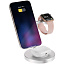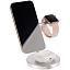 Станция может заряжать одновременно 3 устройства: беспроводные наушники с соответствующей функцией беспроводного заряда, смартфон, часы Apple Watch 2–8. Смартфоны iPhone 12–15 удерживаются на станции встроенными в их корпус магнитами. Прочие телефоны рекомендуем дополнить магнитным стикер-адаптером Magmate для надежного удержания на зарядной области.