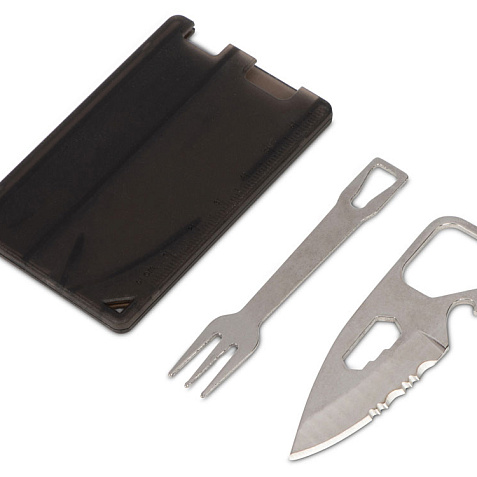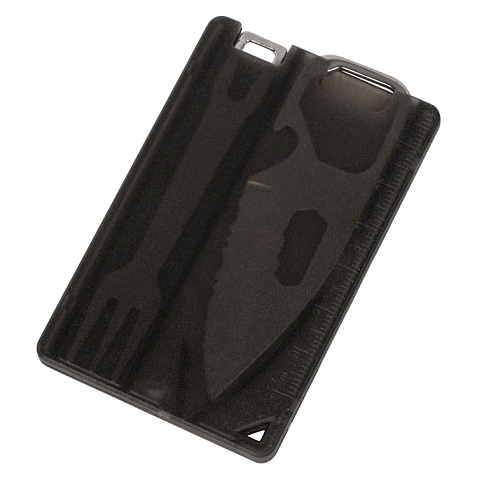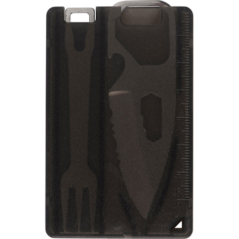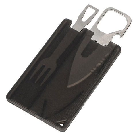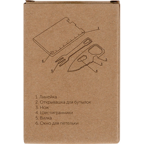 Компактный мультитул в форме карты. - Линейка - Открывашка для бутылок - Нож - Шестигранники - Вилка - Окно для петельки Тампопечать (1 цвет (цветные изделия)) на данный товар осуществляется бесплатно. Оплачивается только настройка оборудования в размере 4500 рублей на весь тираж.