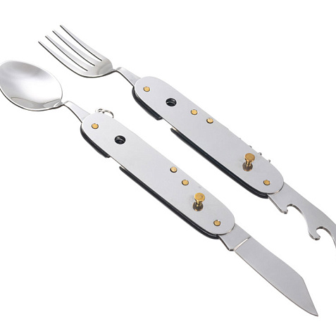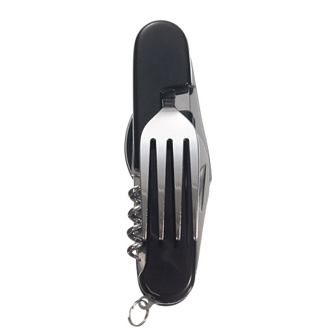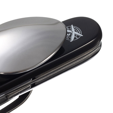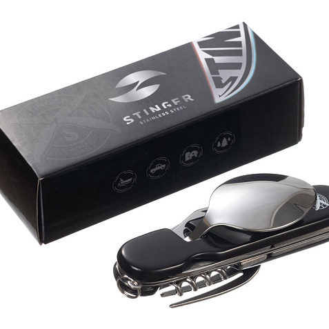 Нож перочинный STINGER имеет 8 функций: 1. Лезвие 2. Ложка 3. Вилка 4. Открывалка для бутылок 5. Консервный нож 6. Ледокол 7. Штопор 8. Кольцо для ключей ХАРАКТЕРИСТИКИ Материалы: • лезвие/инструменты: нержавеющая сталь AISI 420, твердость 44-48 HRC • рукоять: нержавеющая сталь AISI 420, твердость 44-48 HRC • накладки рукояти: АБС-пластик Размер: 109 мм Вес: 146 г Цвет накладок рукояти: черный Накладки рукояти ножа не подлежат замене. Нож нельзя мыть в посудомоечной машине. Упаковка: картонная коробка Нож разборный, состоит из двух частей. Разборка: разогнуть вилку и ложку, разделить на 2 части.