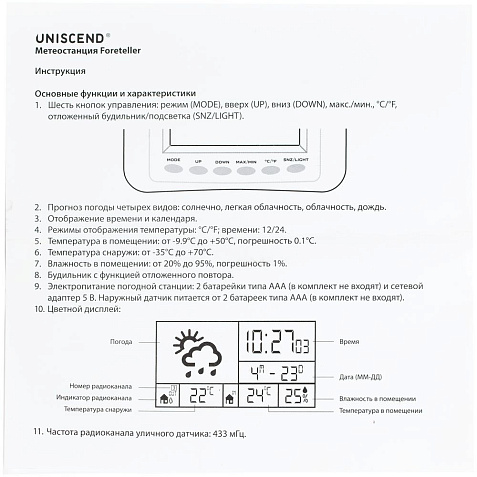 - Рекомендуется использовать 2 батарейки ААА для автономного питания станции и сохранения данных при отключении питания от сети (в комплект не входят) и 2 батарейки ААА для питания уличного датчика (в комплект не входят). Если датчик эксплуатируется на морозе ниже –15–20 °C, рекомендуется устанавливать литиевые батареи ААА.