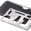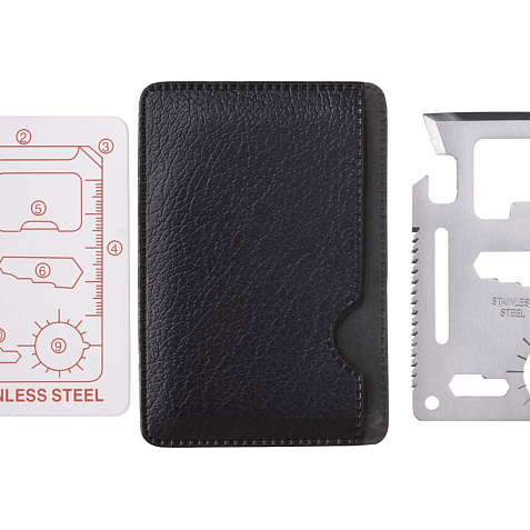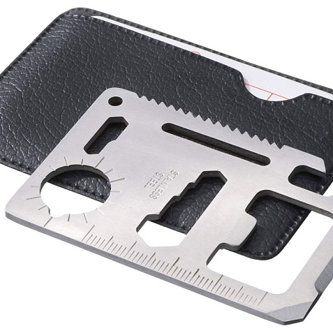 Многофункциональная карта. 11 функций в одной карте - нож, консервный нож, отвертка, линейка, открывалка, 2-х и 4-х позиционный гаечный ключ, разводной гаечный ключ, режущий диск, брелок, указатель направления. Чехол из кожзаменителя. Тиснение (Фольга) на данный товар осуществляется бесплатно. Оплачивается только настройка оборудования в размере 8700 рублей на весь тираж.
