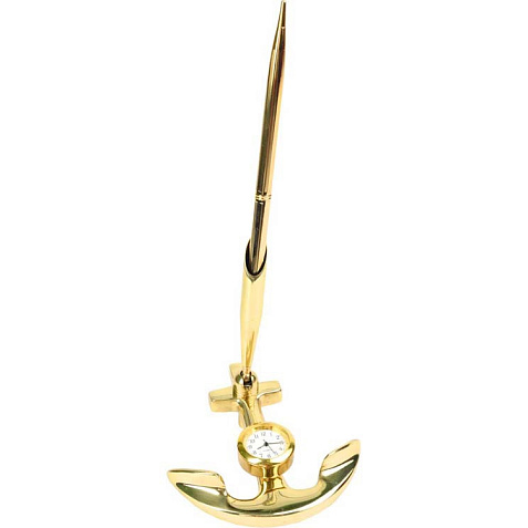 Небольшой настольный прибор в форме якоря оборудован подставкой для ручки и часами. Прибор сделан из латуни и обладает стильной золотистой расцветкой. Прибор идеально подойдет в качестве подарка представителям судоходных компаний, а также любителям рыбалки и моря. Гравировка (оптоволоконный лазер) (Без чернения) на данный товар осуществляется бесплатно. Оплачивается только настройка оборудования в размере 2700 рублей на весь тираж.