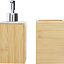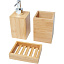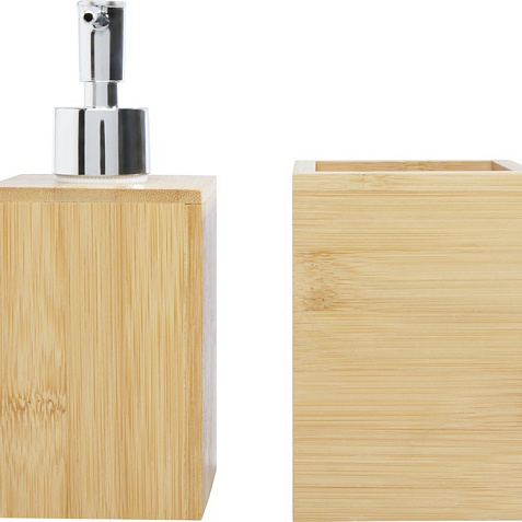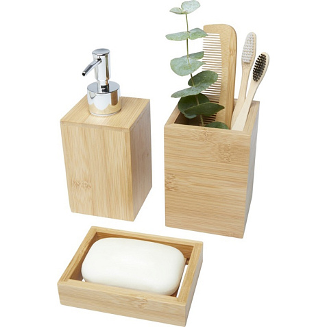 Набор из 3-х аксессуаров из бамбука с современным дизайном для ванной комнаты, состоящий из мыльницы с ситечком (11 x 8,2 x 2,4 см), дозатора для мыла или лосьона (7,1 x 7,2 x 16,8 см) и держателя для зубных щеток (8 x 8 x 11,5 см). Используемый бамбук поставляется и производится в соответствии со стандартами устойчивого развития.