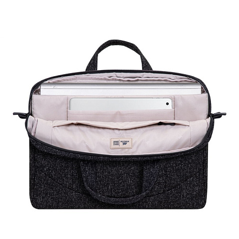 RIVACASE Сумка для ноутбуков до 15.6 Описание: • Стильная сумка из высококачественной, водоотталкивающей ткани. • Легкая, но имеет утолщенные стенки для защиты ноутбука от случайных ударов и царапин, а также от пыли и влаги. • Основное отделение для ноутбука имеет также два внутренних отделения - для планшета до 10.5 и документов. • Два внешних кармана для хранения аксессуаров, визитных карт, смартфона. • Двойная застежка молния для удобного доступа к устройству. • Удобные ручки для переноски и наплечный ремень помогут чувствовать себя комфортно в самом долгом путешествии. • Внутренний размер 39,5 х 28 х 4 см. Термотрансфер (1 цвет (цветные изделия)) на данный товар осуществляется бесплатно. Оплачивается только настройка оборудования в размере 10000 рублей на весь тираж.
