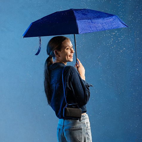 Миниатюрный зонт Color Action укроет от дождя или палящего солнца. Благодаря небольшим размерам и чехлу-кейсу на длинном ремешке его удобно брать с собой.