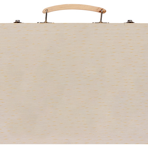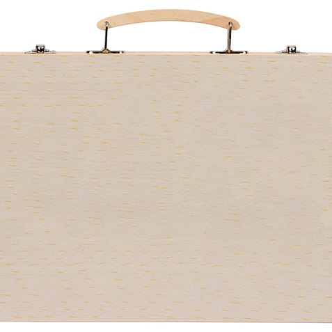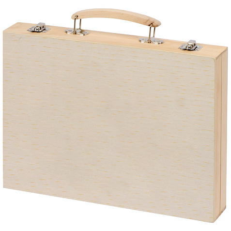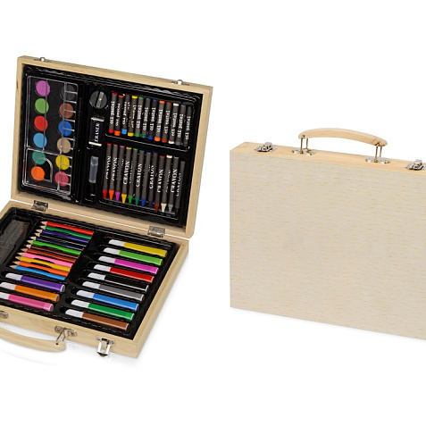 Набор из 67 предметов для рисования. Набор включает 12 акварельных красок, 12 цветных карандашей, 12 масляных пастелей, 12 фломастеров, 12 мелков, клей, резинку, точилку, карандаш HB, линейку и кисточку. Набор упакован в деревянный чемоданчик. Гравировка (CO2 лазер) (Без чернения) на данный товар осуществляется бесплатно. Оплачивается только настройка оборудования в размере 2700 рублей на весь тираж.