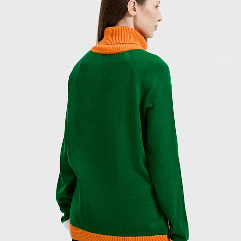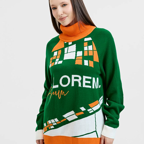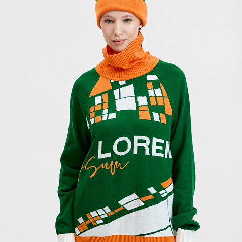 Модель: джемпер, модель унисекс, рукав — реглан, полочка — жаккард, 2–3 цвета нитей, спинка и рукава однотонные — кулирная гладь.