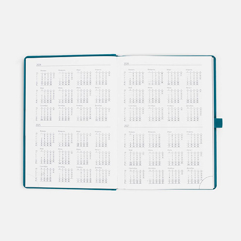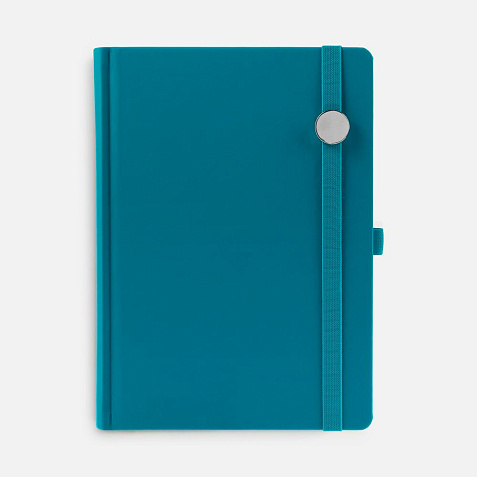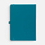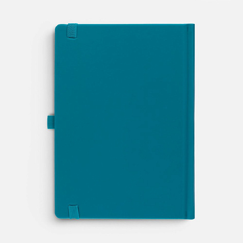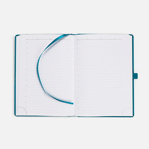 Ежедневник с твердой обложкой без поролона, выполнен из материала Soft Touch, цвет морской волны II, дополнен резинкой шириной 1 см, петлей-резинкой для ручки, капталом и ляссе темно-бирюзового цвета.