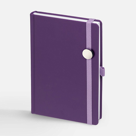 Ежедневник с твердой обложкой без поролона, выполнен из материала Soft Touch, фиолетовый UU, дополнен резинкой шириной 1 см, петлей-резинкой для ручки, капталом и ляссе в цвет обложки.