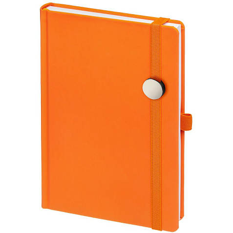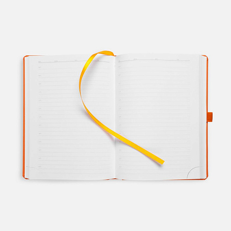 Ежедневник с твердой обложкой без поролона, выполнен из материала Soft Touch, оранжевый ОО, дополнен резинкой шириной 1 см, петлей-резинкой для ручки, капталом и ляссе оранжевого цвета.