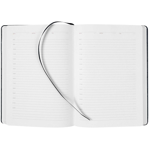 Ежедневник с твердой обложкой, выполнен из материала Brand, черный АА, с тиснением и выборочным УФ-лаком. Дополнен ляссе в цвет обложки.