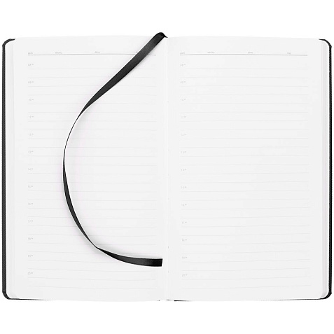 Ежедневник с твердой обложкой, выполнен из материала Canyon, черный АА, дополнен ляссе в цвет обложки.
