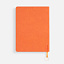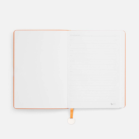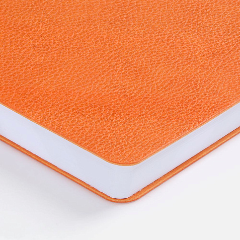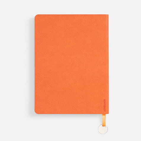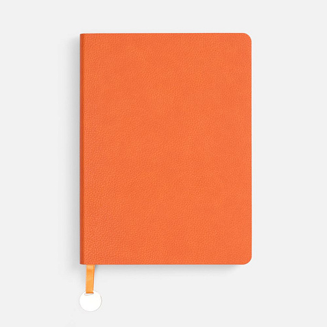 Ежедневник с гибкой обложкой, выполнен из материал La Fite, оранжевый ОО, дополнен ляссе в цвет обложки с металлическим шильдом.