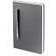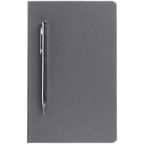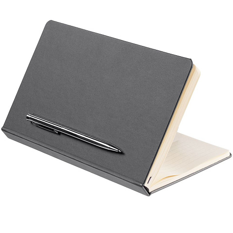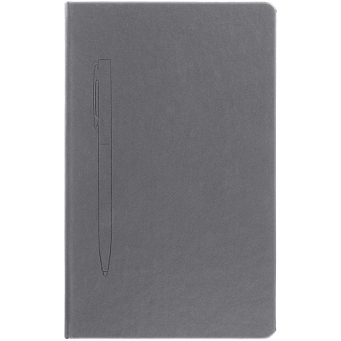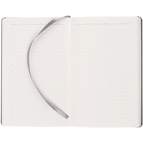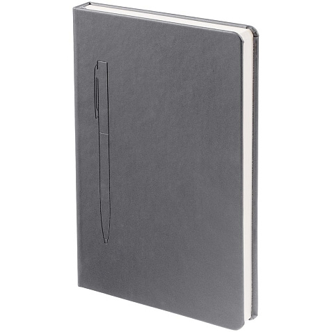Ежедневник в твердой обложке, выполненной из материала Soft Touch Pearl, серый СС, дополнен цветным ляссе и магнитом, удерживающим ручку.