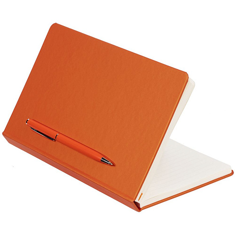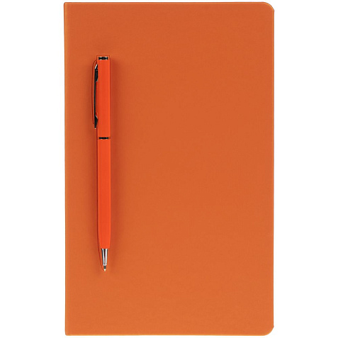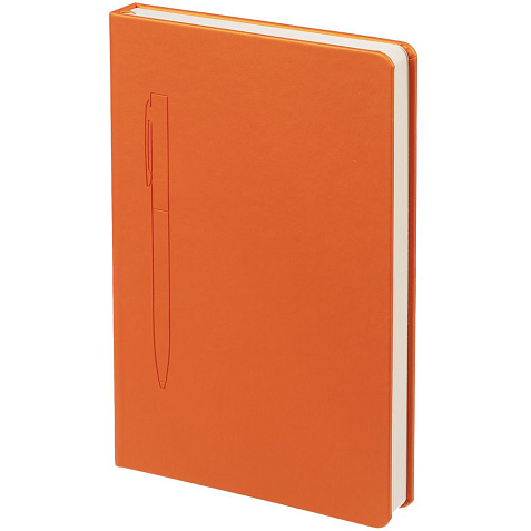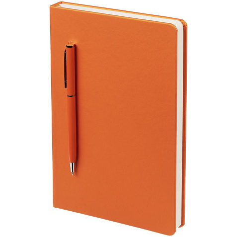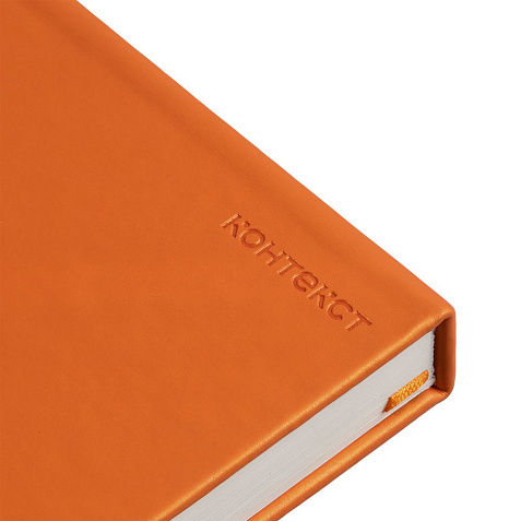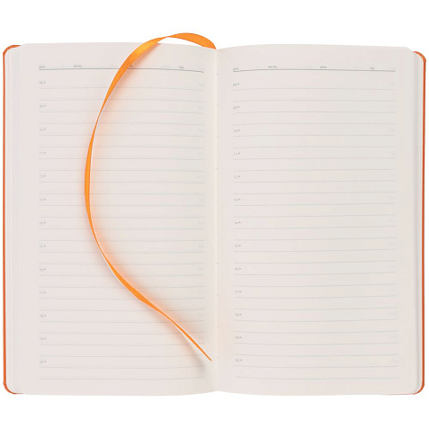 Ежедневник в твердой обложке, выполненной из материала Soft Touch Pearl, оранжевый ОО, дополнен цветным ляссе и магнитом, удерживающим ручку.