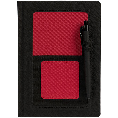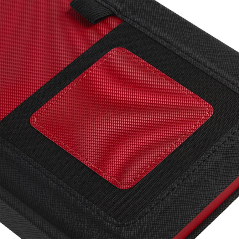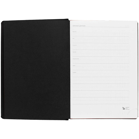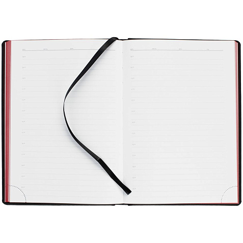 Твердая обложка выполнена из материалов Nice Touch, черный АА, и Canyon, красный РР. Ежедневник дополнен капталом, резинкой для ручки и ляссе черного цвета.