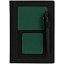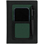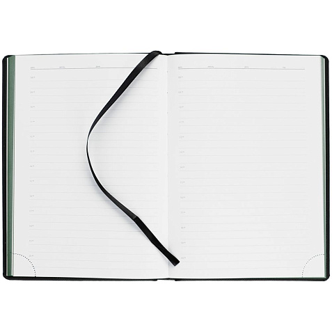 Твердая обложка выполнена из материалов Nice Touch, черный АА, и Canyon, зеленый FF. Ежедневник дополнен капталом, резинкой для ручки и ляссе черного цвета.