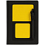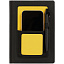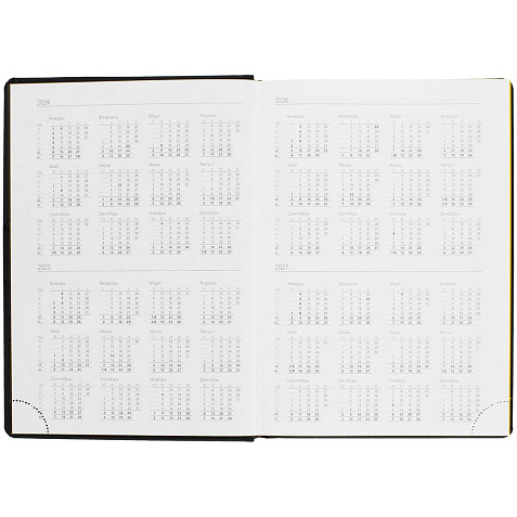 Твердая обложка выполнена из материалов Nice Touch, черный АА, и Canyon, желтый КК. Ежедневник дополнен капталом, резинкой для ручки и ляссе черного цвета.
