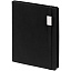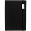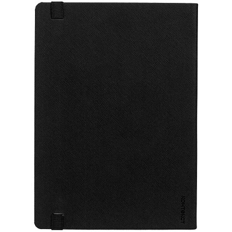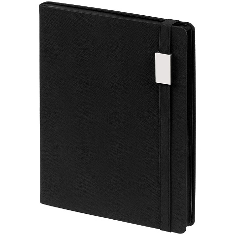 Ежедневник с полутвердой обложкой выполнен из материала Nice Touch, черный АА, и дополнен резинкой шириной 1 см с металлическим шильдом и ляссе черного цвета.
