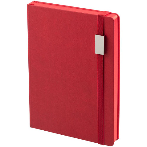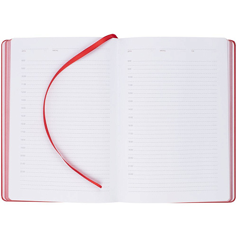 Ежедневник с твердой обложкой, выполнен из материала Latte, красный РР, обрез красного цвета, дополнен ляссе красного цвета ирезинкой с металлическим шильдом.