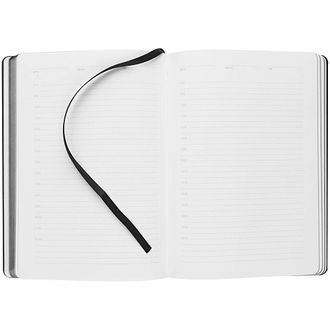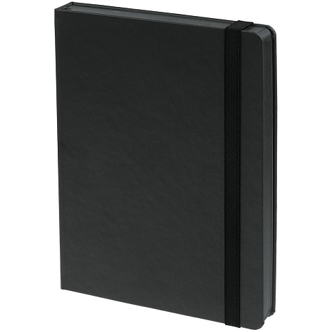 Ежедневник с твердой обложкой, выполнен из материала Latte, черный АА, обрез черного цвета, дополнен резинкой и ляссе черного цвета.