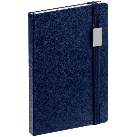 Ежедневник с твердой обложкой, выполнен из материала LaFite, темно-синий ХХ, дополнен резинкой с металлическим прямоугольным шильдом и ляссе в цвет обложки.