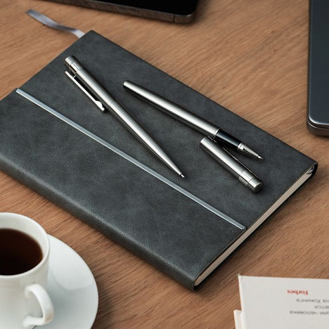 Ежедневник с гибкой обложкой, клапаном на магните и металлической отделкой клапана. Выполнен из материала Petrus, серый СС, дополнен серым ляссе.