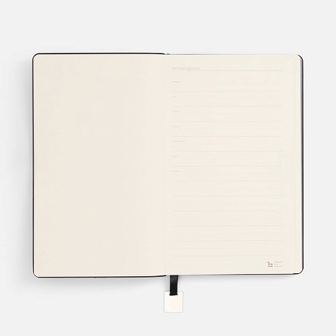 Ежедневник с гибкой обложкой, выполнен из материалов Soft Touch Pearl, черный АА, и Latte, черный (внутренняя часть обложки), дополнен ляссе в цвет обложки с металлическим шильдиком.