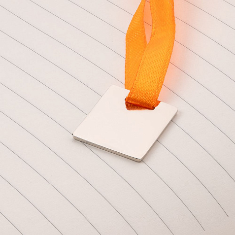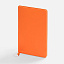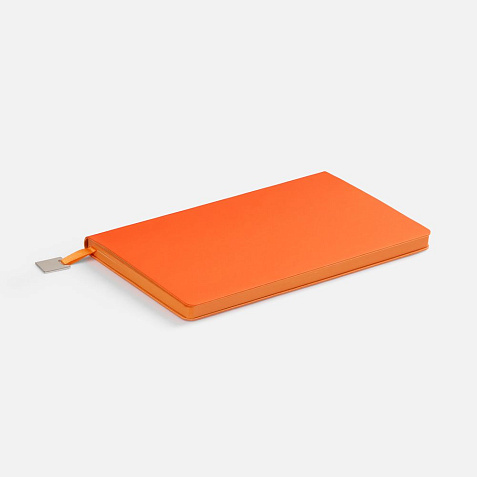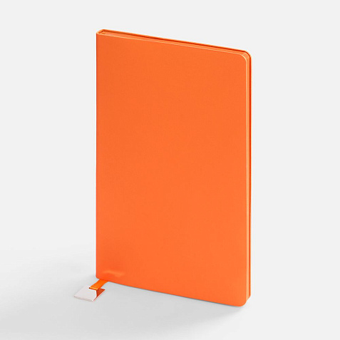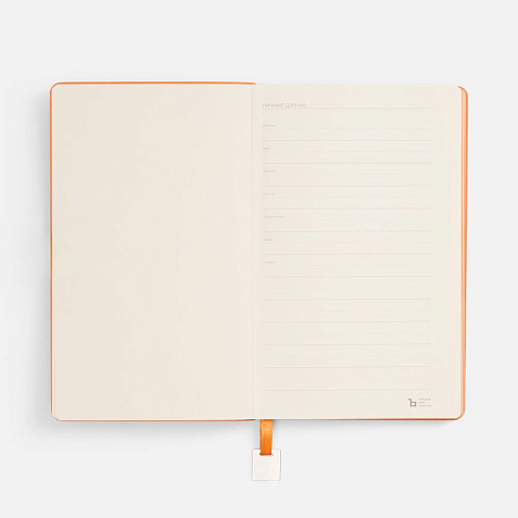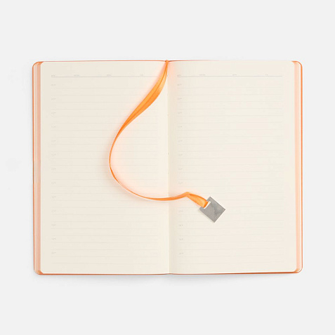 Ежедневник с гибкой обложкой, выполнен из материалов Soft Touch Pearl, оранжевый ОО, и Latte, оранжевый (внутренняя часть обложки), дополнен ляссе в цвет обложки с металлическим шильдиком.