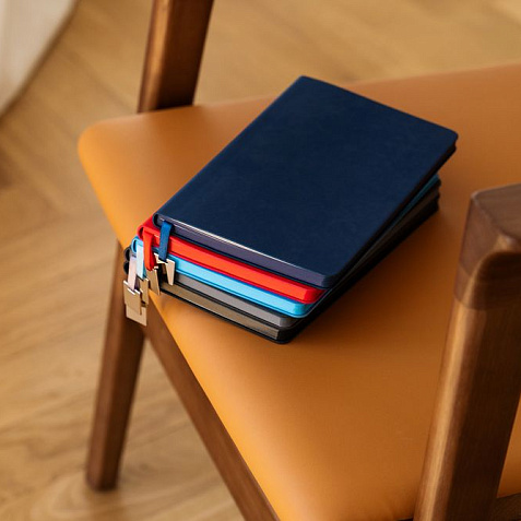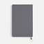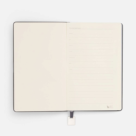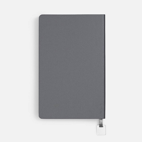 Ежедневник с гибкой обложкой, выполнен из материалов Soft Touch Pearl, серый СС, и Latte, серый (внутренняя часть обложки), дополнен ляссе в цвет обложки с металлическим шильдиком.