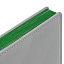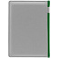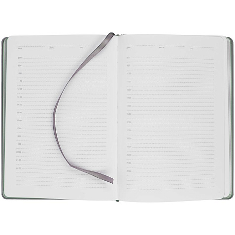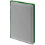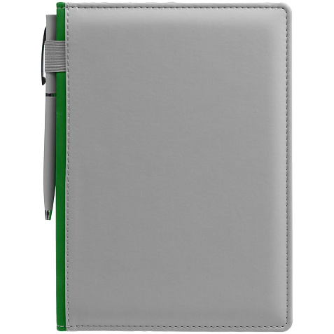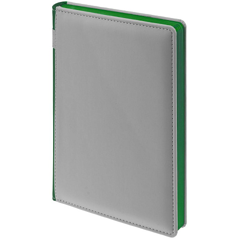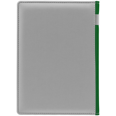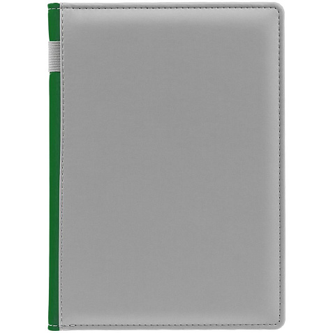Твердая обложка с поролоном, материал обложки — Soft Touch, серый СС и Soft Touch Ultra, зеленый FF. На корешке ежедневника находится петля из резинки.