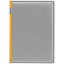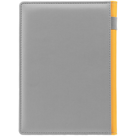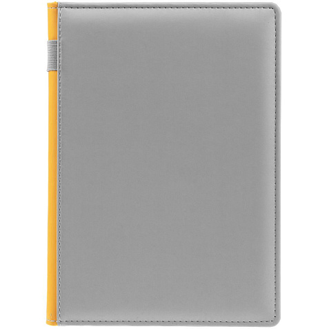 Твердая обложка с поролоном, материал обложки — Soft Touch, серый СС и Soft Touch, желтый КК. На корешке ежедневника находится петля из резинки.