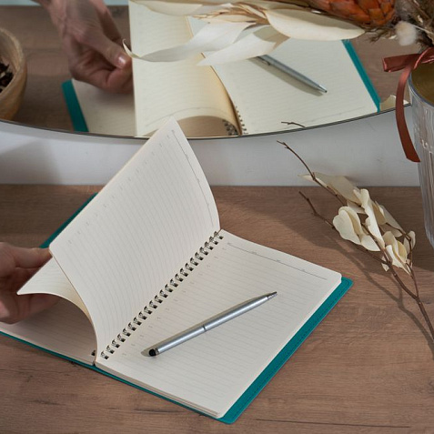 Ежедневник с гибкой обложкой, выполнен из материалов Soft Touch, синий и Nice Touch, голубой.