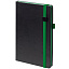 Ежедневник с твердой обложкой, выполнен из материала Waltz, черный АА, дополнен зеленой резинкой с металлическим шильдом и ляссе.