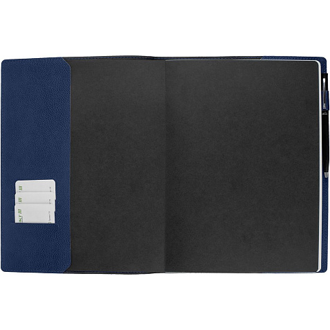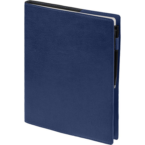 Ежедневник в суперобложке выполнен из материала La Fite, синий НН, дополнен ляссе и капталом черного цвета.
