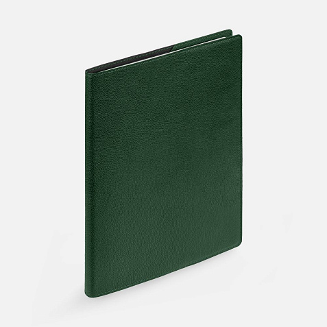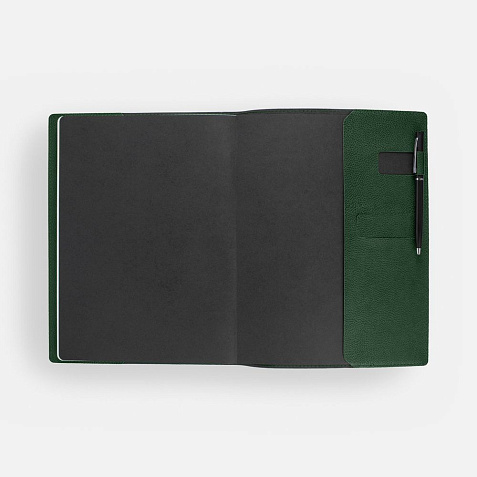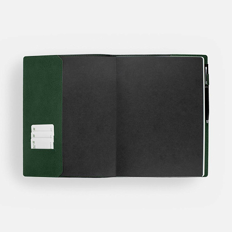 Ежедневник в суперобложке выполнен из материала La Fite, зеленый FF, дополнен ляссе и капталом черного цвета.