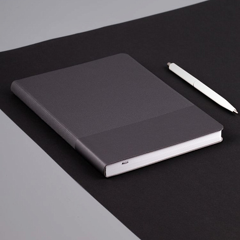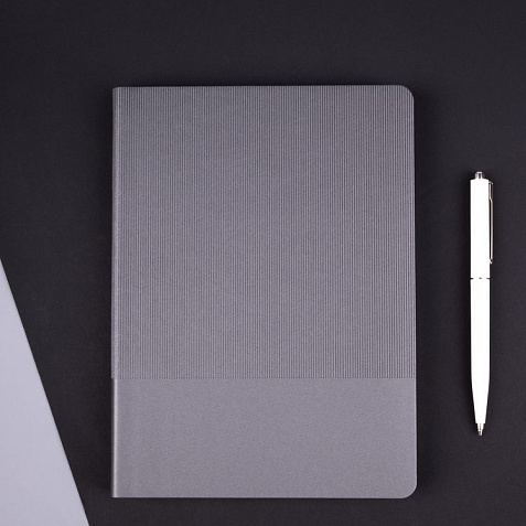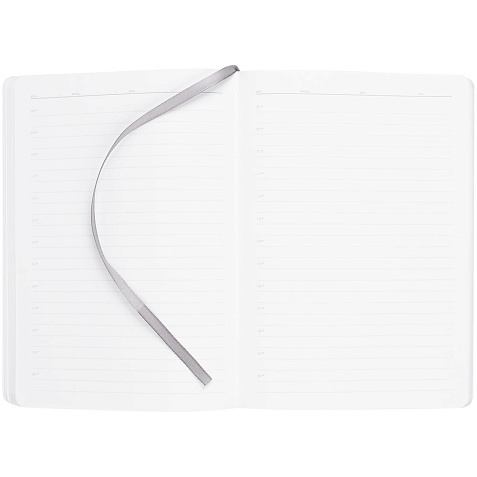 Ежедневник с гибкой обложкой выполнен из материала Soft Touch Perl, серый СС и Latte, серый (внутренний материал); дополнен ляссе серого цвета и фактурным тиснением обложки.