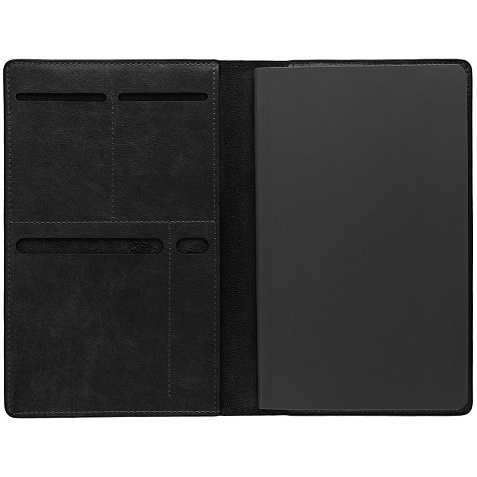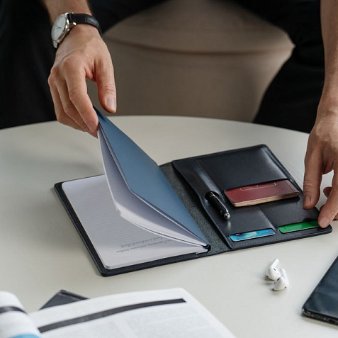 Еженедельник Remini со съемной обложкой-портфолио из натуральной кожи, репсовым ляссе и окрашенным срезом обложки в цвет материала.