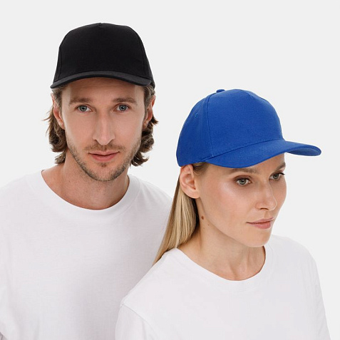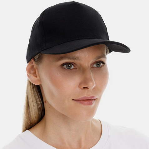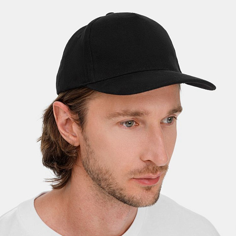 Модель бейсболки с 5-ю клиньями без лобового шва из плотного чесаного хлопка.
