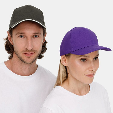 Модель бейсболки с 5-ю клиньями без лобового шва из плотного чесаного хлопка.