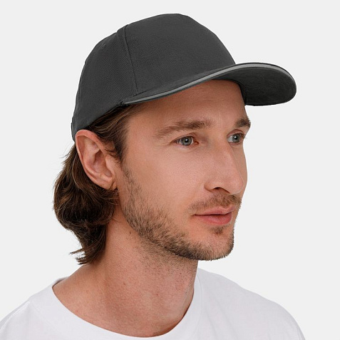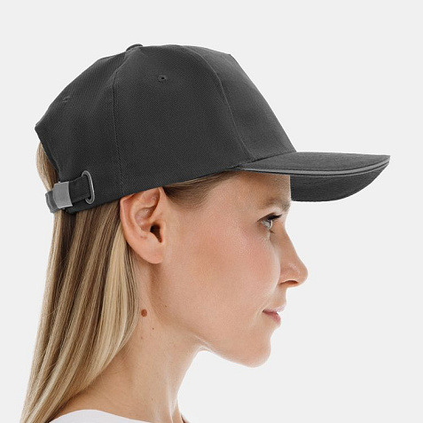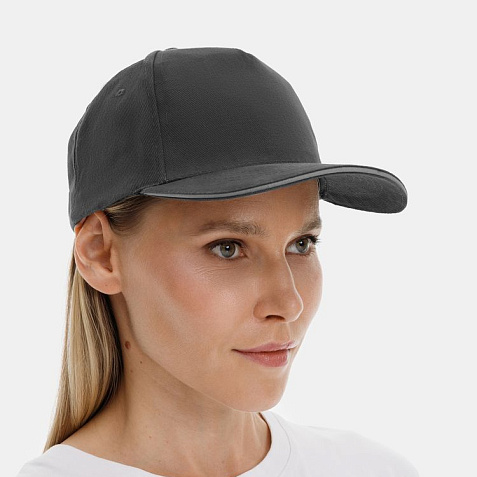Модель бейсболки с 5-ю клиньями без лобового шва из плотного чесаного хлопка.