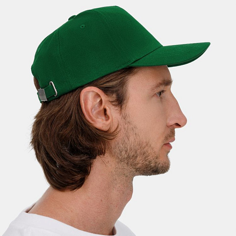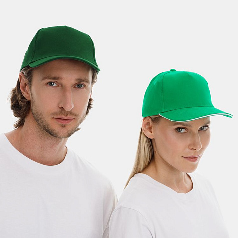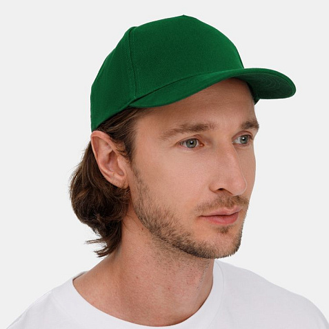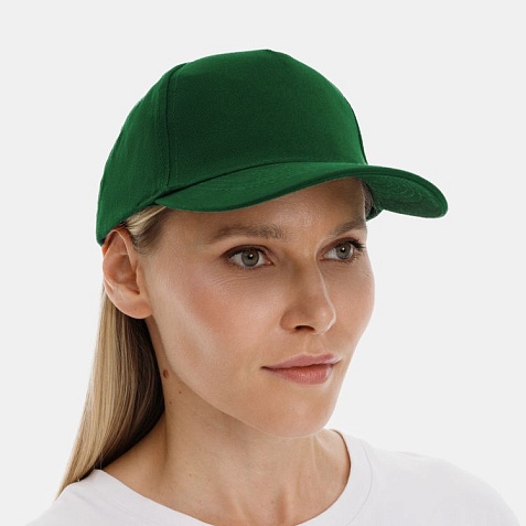 Модель бейсболки с 5-ю клиньями без лобового шва из плотного чесаного хлопка.