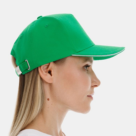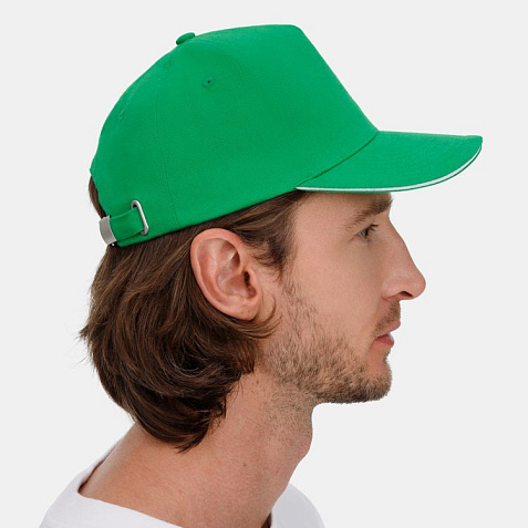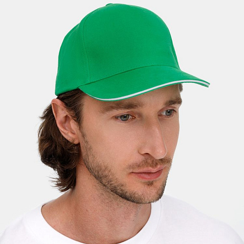 Модель бейсболки с 5-ю клиньями без лобового шва из плотного чесаного хлопка.