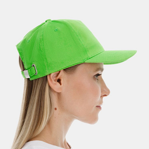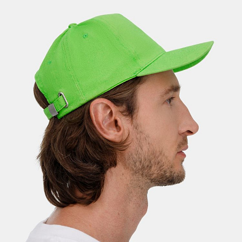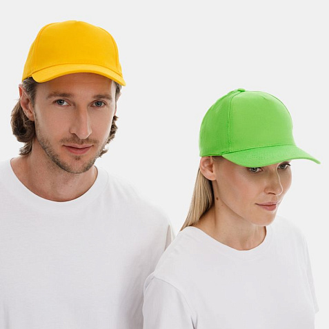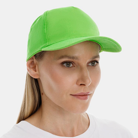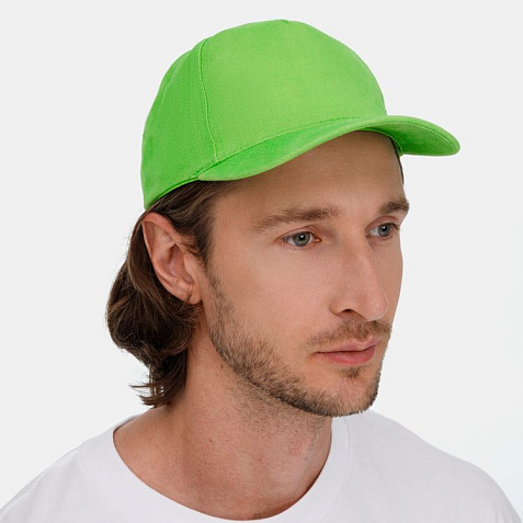 Модель бейсболки с 5-ю клиньями без лобового шва из плотного чесаного хлопка.