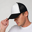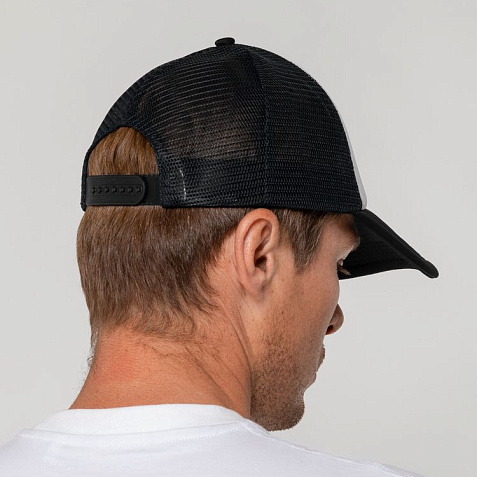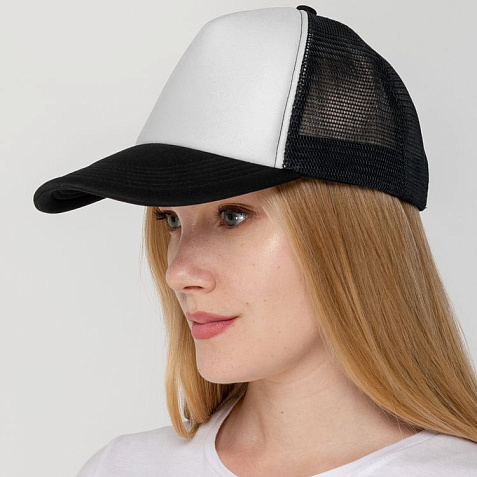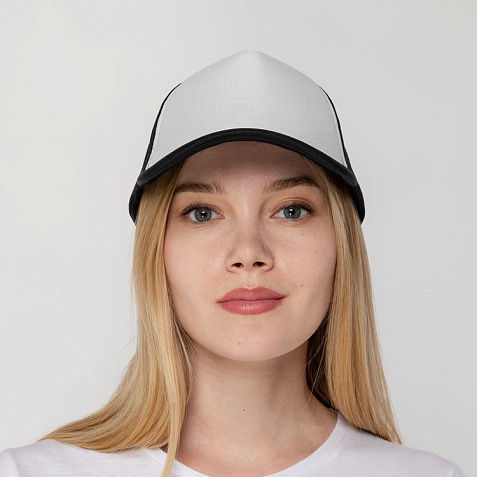 Стандартная модель с 5 клиньями без лобового шва в нестандартном исполнении. Передний клин и козырек выполнены из полиэстера с наполнителем из поролона, боковые и задние клинья — из сетки. Размер регулируется с помощью пластиковой застежки.