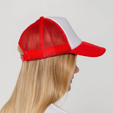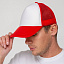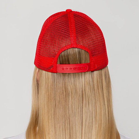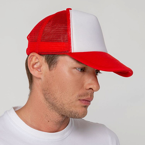 Стандартная модель с 5 клиньями без лобового шва в нестандартном исполнении. Передний клин и козырек выполнены из полиэстера с наполнителем из поролона, боковые и задние клинья — из сетки. Размер регулируется с помощью пластиковой застежки.