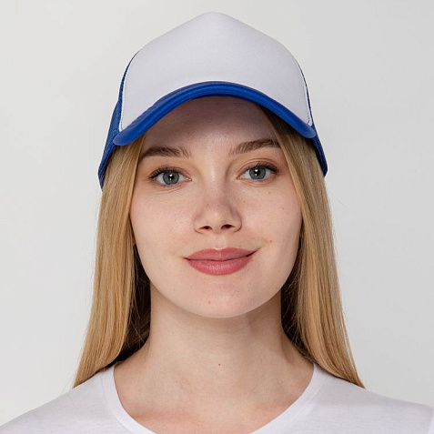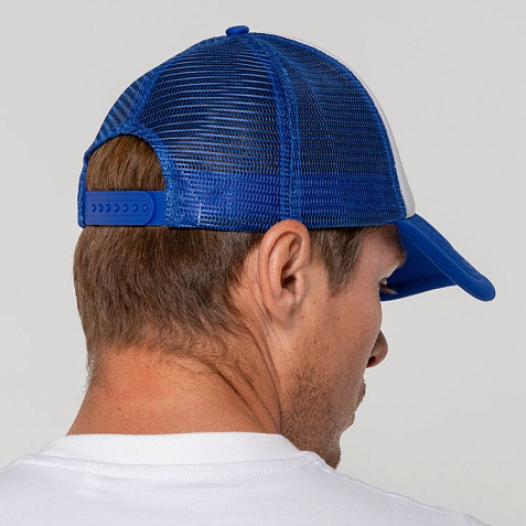 Стандартная модель с 5 клиньями без лобового шва в нестандартном исполнении. Передний клин и козырек выполнены из полиэстера с наполнителем из поролона, боковые и задние клинья — из сетки. Размер регулируется с помощью пластиковой застежки.