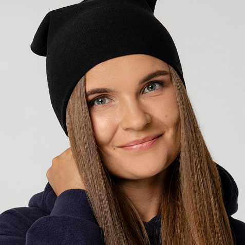 Двухслойная шапка-бини тонкой вязки, которую можно носить как с подворотом, так и без.